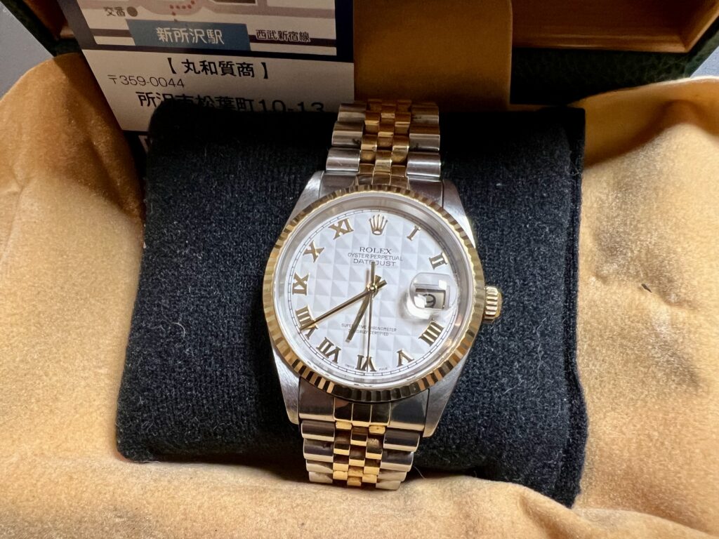 先日、所沢市にお住まいのお客様から【ロレックス デイトジャスト Ref.16233 ホワイトピラミッド ローマン文字盤】をお買取させていただきました。いつも当質屋をご利用いただく、リピーター様からお買取をさせていただきました。誠にありがとうございます。